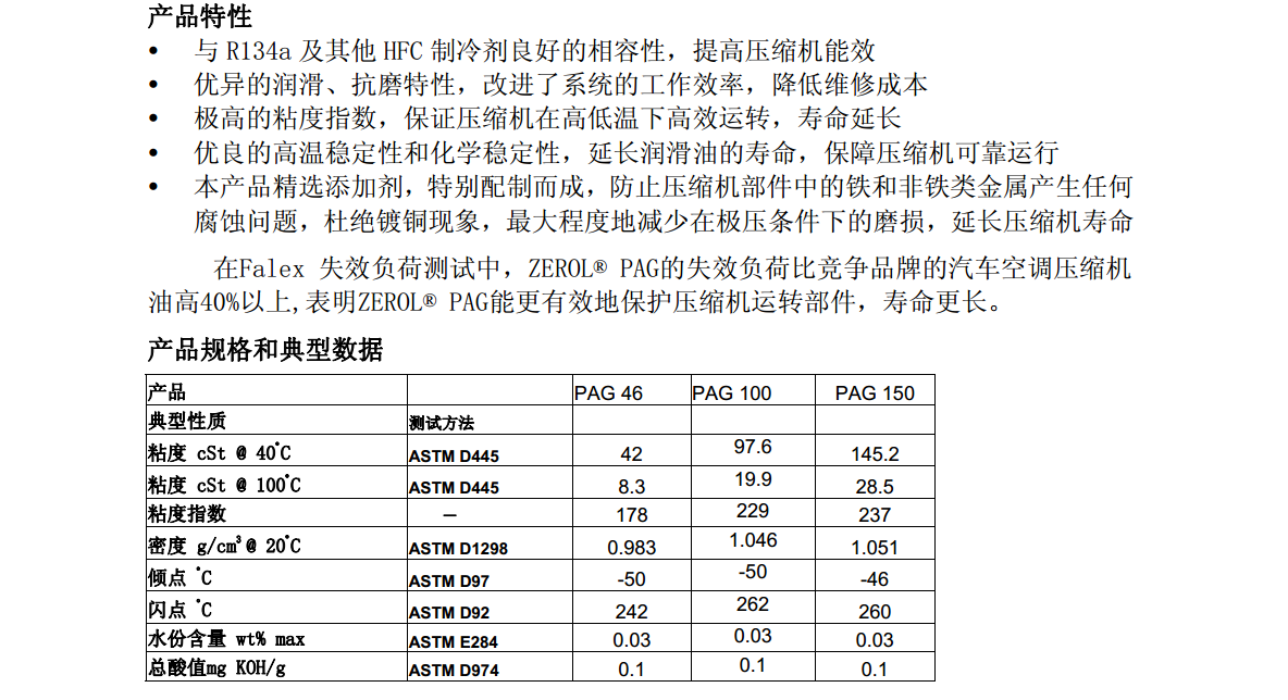 ZEROL?PAG系列的粘度包括46cSt,100cSt和150cSt(@40℃),不僅適用于R134a或其他HFC制冷劑,也與R12有良好的相容性,可用于準(zhǔn)備把氟里昂R12改為R134a的舊汽車空調(diào)系統(tǒng)。 三分鐘極速報(bào)價(jià) 一對一免費(fèi)選型咨詢 電話:400-860-8288