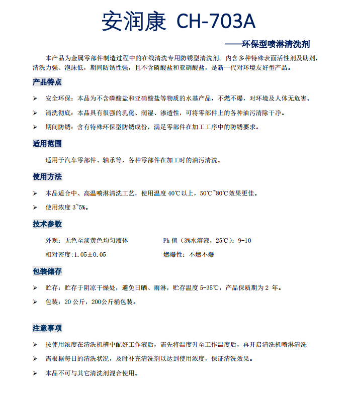 安潤康CH-703A軸承除油環(huán)保型噴淋清洗劑