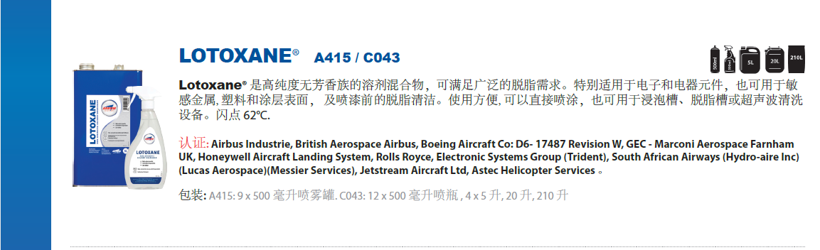 英國ARROW公司生產的安全清洗劑 LOTOXANE是一種高科技產品,系無毒、無色、無味的高純度清潔劑,用來替代因含毒性或操作不便等原因而禁止使用的傳統的氯化碳氫、三氯乙烷、三氯乙烯等溶劑,專對電氣及電子組件進行清潔的清洗劑。它也可安全地配合超聲波設備,作為金屬、特殊金屬、塑料制品及噴涂表面包括氯化橡膠表層的脫脂劑。