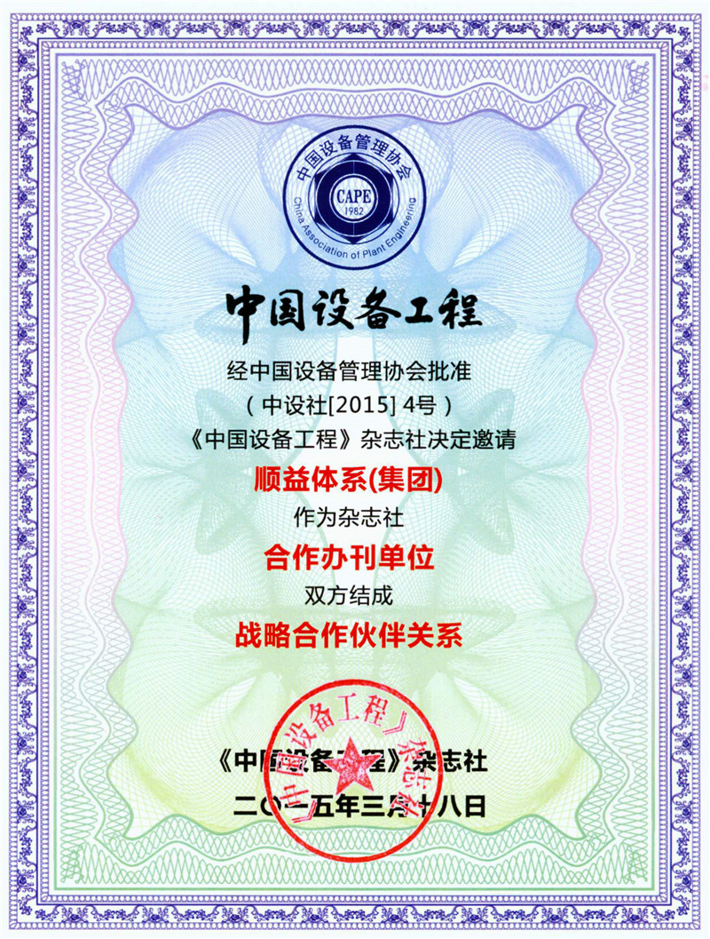 會議上,《中國設備工程》雜志社正式授予順益體系(集團)合作辦刊單位&戰(zhàn)略合作伙伴牌匾。2015年3月18日,經(jīng)中國設備管理協(xié)會批準,順益體系(集團)正式成為《中國設備工程》雜志社唯一合作辦刊單位,簽署了戰(zhàn)略合作協(xié)議,建立起全面的戰(zhàn)略合作伙伴關系。順益體系(集團)經(jīng)授權成立《中國設備工程》雜志社廣東省工作站,協(xié)助《中國設備工程》雜志社開展廣告及發(fā)行等相關業(yè)務,與《中國設備工程》雜志社的合作將促進公司更快速地了解行業(yè)的發(fā)展動態(tài)及更專業(yè)地掌握相關領域的前沿技術。