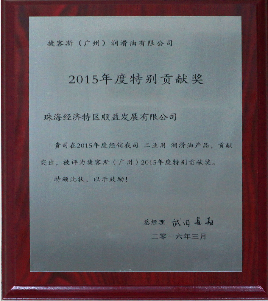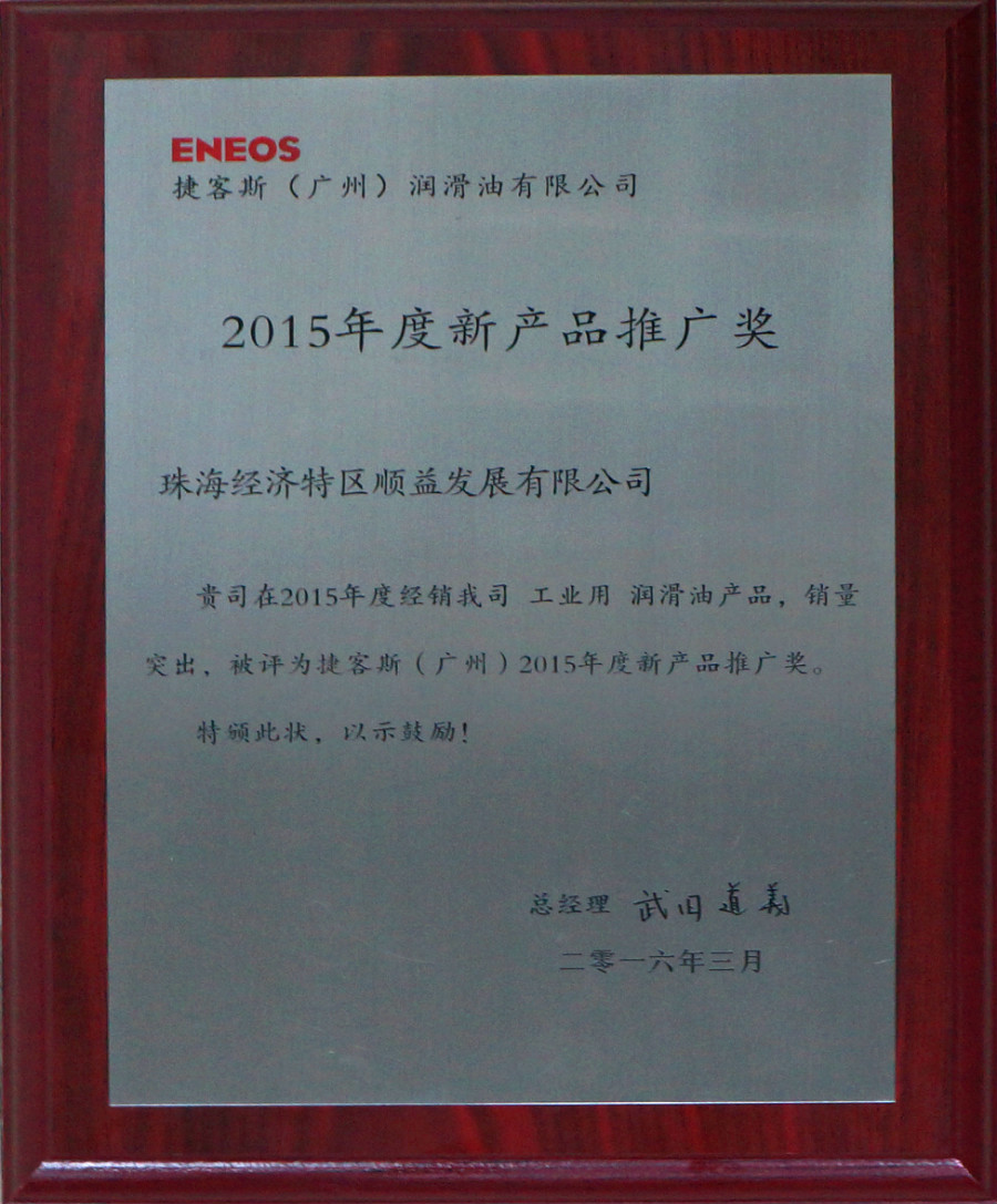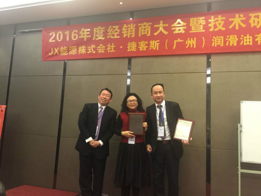 順益體系(集團)在與JX集團多年友好合作中,已連續4年獲得了“捷客斯(廣州)年度金牌代理店”榮譽。在本次大會上,2015年,順益在新產品推廣及業績表現突出,榮獲了2015年度新產品推廣獎和2015年特別貢獻獎兩項大獎
