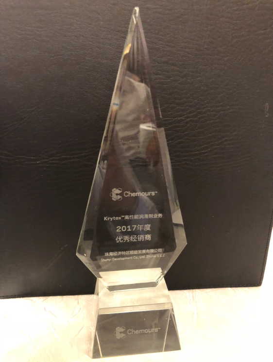 在充滿挑戰的2017年里,珠海經濟特區順益發展有限公司在Krytox?高性能潤滑油業務領域業績突出業績表現突出,榮獲科慕Chemours 2017年度優秀經銷商獎。