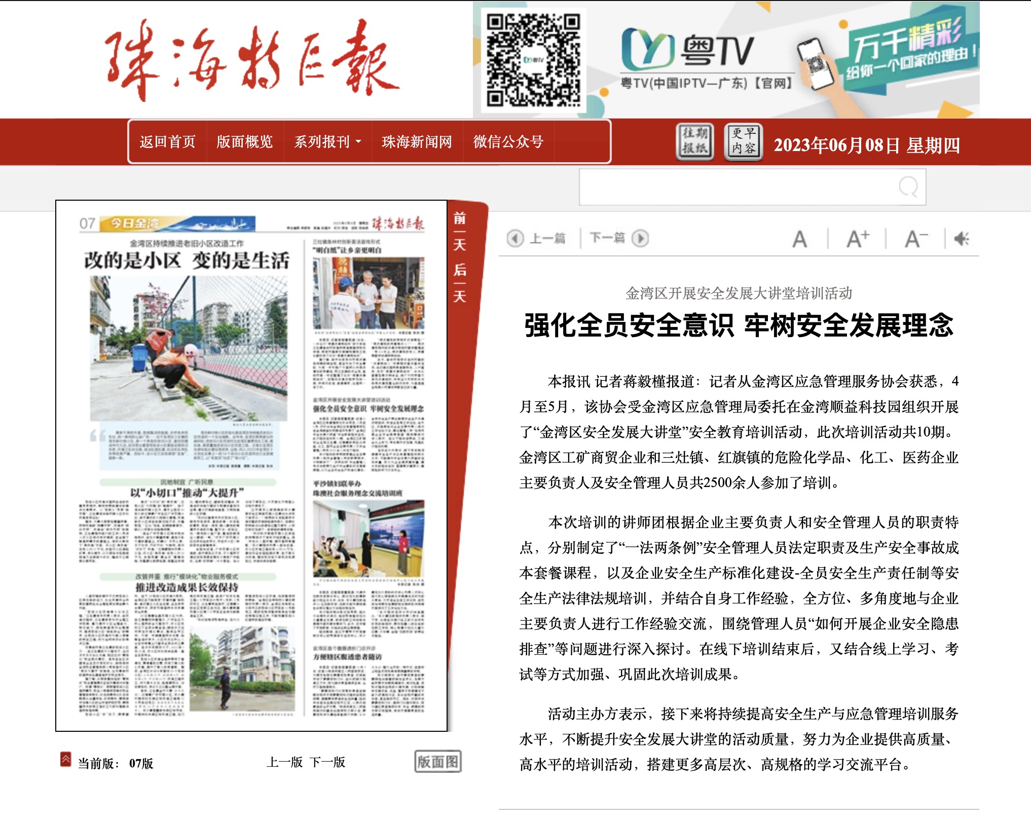 珠海特區報 記者蔣毅槿報道:記者從金灣區應急管理服務協會獲悉,4月至5月,該協會受金灣區應急管理局委托在金灣順益科技園組織開展了“金灣區安全發展大講堂”安全教育培訓活動,此次培訓活動共10期。金灣區工礦商貿企業和三灶鎮、紅旗鎮的危險化學品、化工、醫藥企業主要負責人及安全管理人員共2500余人參加了培訓。