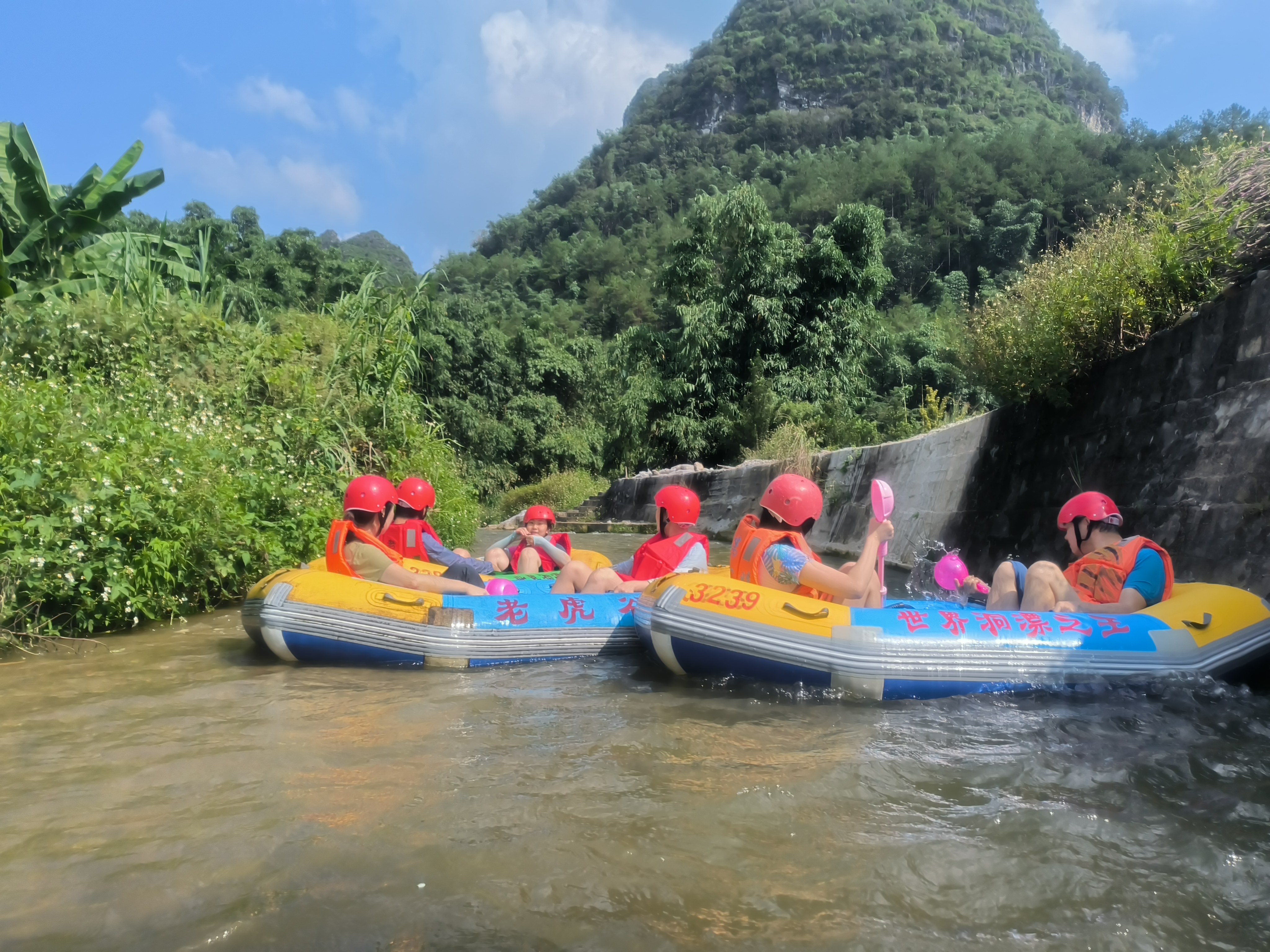 在藍(lán)天白云下,在老虎谷的河流中,大家架著小船,孩子們?cè)诟改傅谋Wo(hù)下,在時(shí)而湍急時(shí)而平緩的河水流中順流而下,在大自然的懷中演繹精彩的瞬間,感受滿滿的清爽與激情。