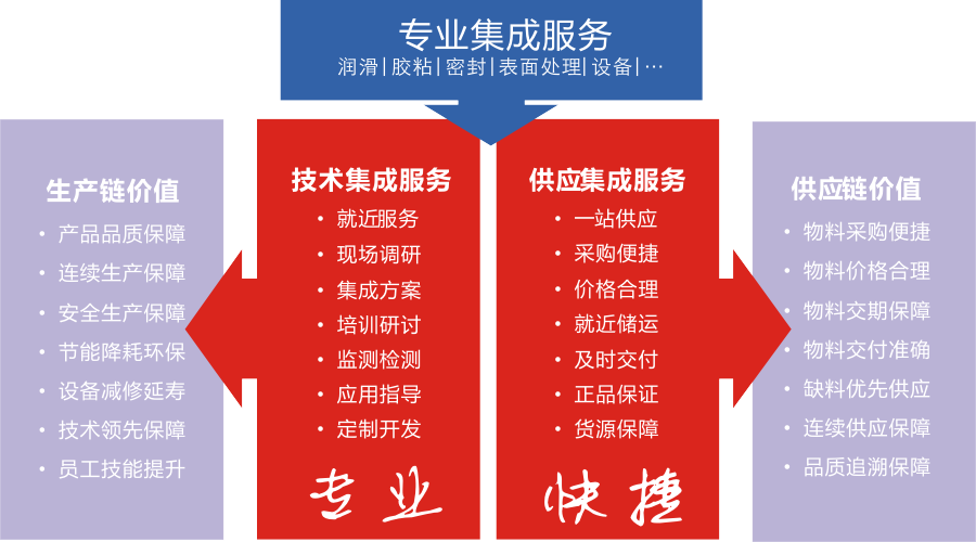 在工業(yè)企業(yè)中的潤(rùn)滑、膠粘、密封、表面處理等關(guān)聯(lián)的領(lǐng)域,無(wú)論是BOM直接物料,還是MRO非生產(chǎn)性物料,都具有針對(duì)性強(qiáng)、消耗量大、重復(fù)消耗等特點(diǎn),因而更受到采購(gòu)部門(mén)的關(guān)注,迫切希望對(duì)物料和供應(yīng)商進(jìn)行整合,以降低直接和隱形的采購(gòu)成本;同時(shí),這些化學(xué)類(lèi)的物料,不同于工具、五金件之類(lèi)的物料,在使用上具備很強(qiáng)的專(zhuān)業(yè)性,對(duì)應(yīng)用技術(shù)服務(wù)有著較高的要求,因此,研發(fā)、使用部門(mén)亦迫切地希望具備專(zhuān)業(yè)技術(shù)能力的服務(wù)商能提供專(zhuān)業(yè)快捷的現(xiàn)場(chǎng)服務(wù)。顯而易見(jiàn),上述領(lǐng)域的集成服務(wù)具有整合的價(jià)值,受到客戶(hù)的關(guān)注,也具有長(zhǎng)期持續(xù)的經(jīng)濟(jì)價(jià)值。